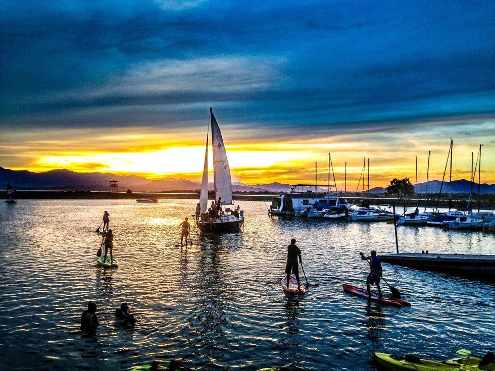 Although freezing, the water is one of my favorite things about Bear Lake. The sun reflects a bright blue color off of the subtle waves, and it is one of the best scenes ever. The amount of time spent on a paddleboard, floats, sailboats, paddleboats, rafts, or other water toys is too high to count. Even when the weather isn't idle, if the wind is blowing the waves are so much fun to jump over, and the water actually feels better than the air. Which you would never believe unless you tried it. Also if you wash your hair in the water it becomes incredibly soft.