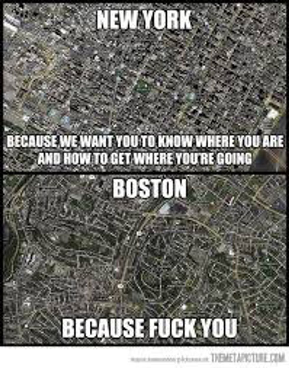 If you've never been to Boston you might not understand that driving there isn't really easy to do. The street plan doesn't make sense and it can be confusing just walking around let alone driving. I swear the people that designed the streets were just trying to mess everyone up.