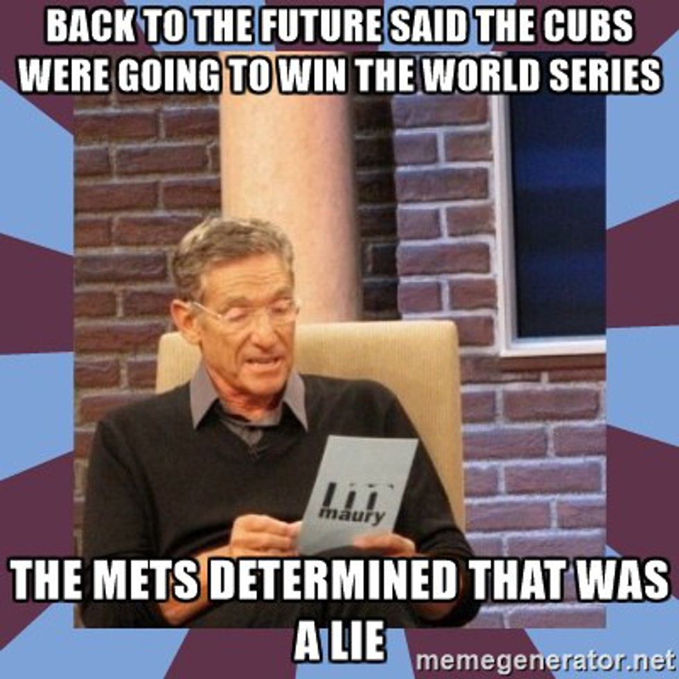 Back to the Future, Part II predicted that the Cubs would sweep Miami in the World Series in 2015. The Mets determined that it would not be. Also, the Miami Marlins are in the National League, so it would have been impossible for the Cubs to play Miami in the World Series. Back to the Future and Maury aside, just being a year off from predicting a Cubs championship is not too shabby!