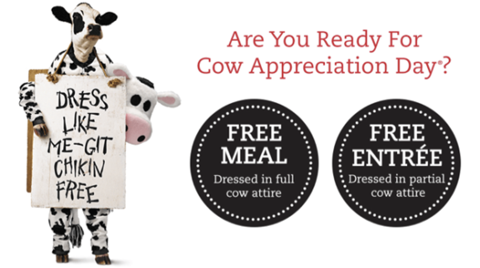 This day should be a national holiday. I mean, who doesn't want to dress up like a cow to get free chicken? If you don't, you probably need to rethink your life choices. My favorite is seeing all the people dressed up and secretly judging and ranking the other costumes. I'm sure the employees hate this day. But you would never know that because they always have a smile on their face.