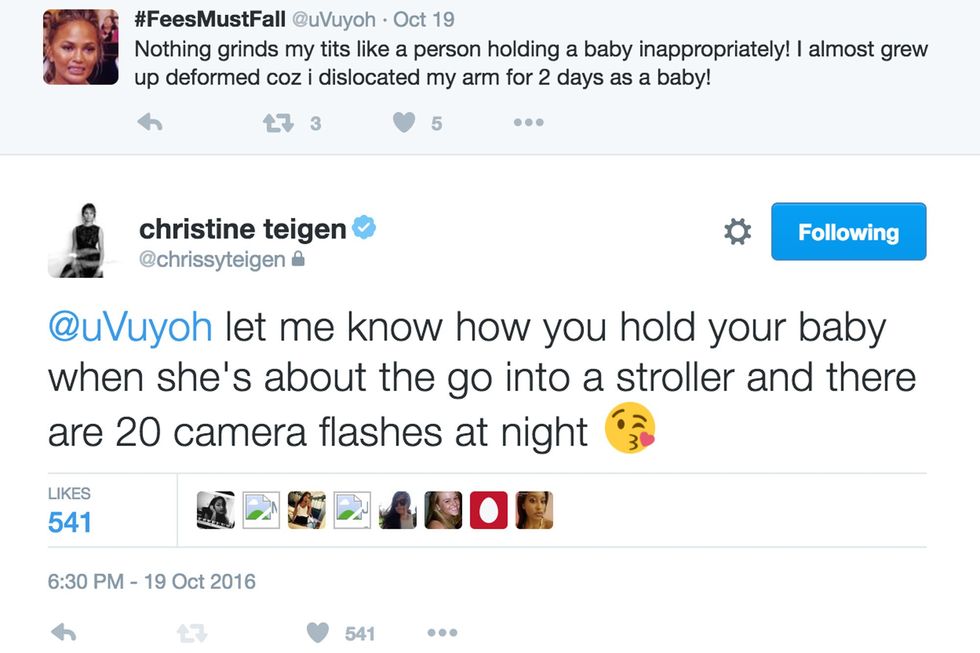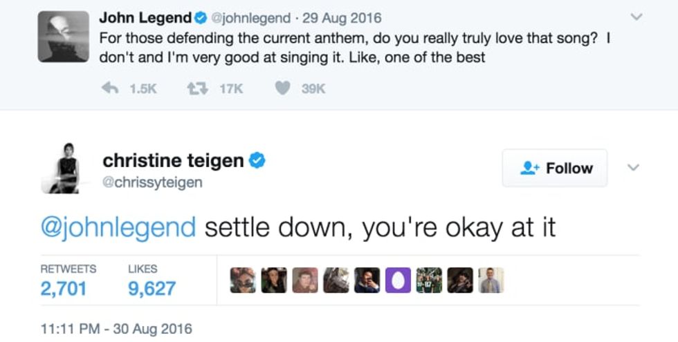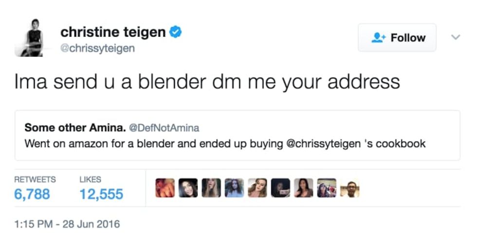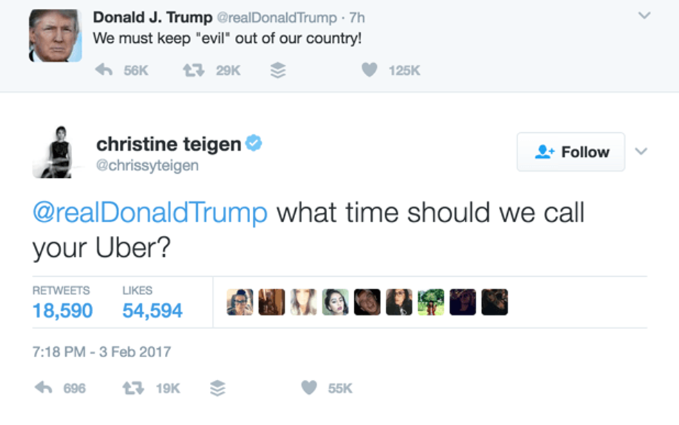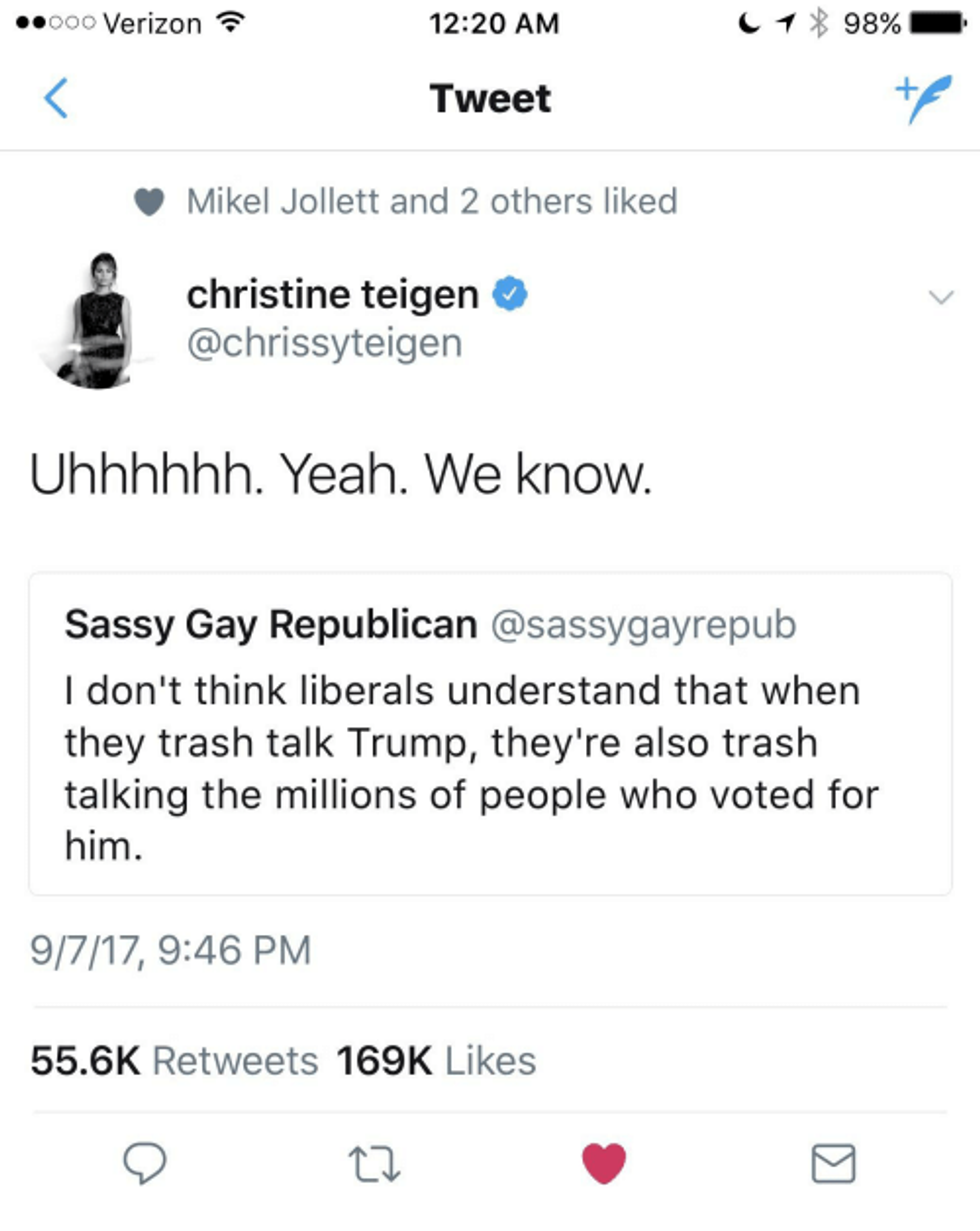 I could put all of Chrissy Teigen's political, Donald Trump smacking tweets here, but the article would never end. The fact of the matter is that not only was she active in Hillary Clinton's historic presidential campaign, but she continues to call out bullshit arguments that try to justify Donald Trump's deplorable behavior. She's not worried about protecting the feelings of those who have no regard for other people's. To put it simply, she kicks ass daily on Twitter and has "presidential" block to prove it! There is one tweet I could just not omit from this article: