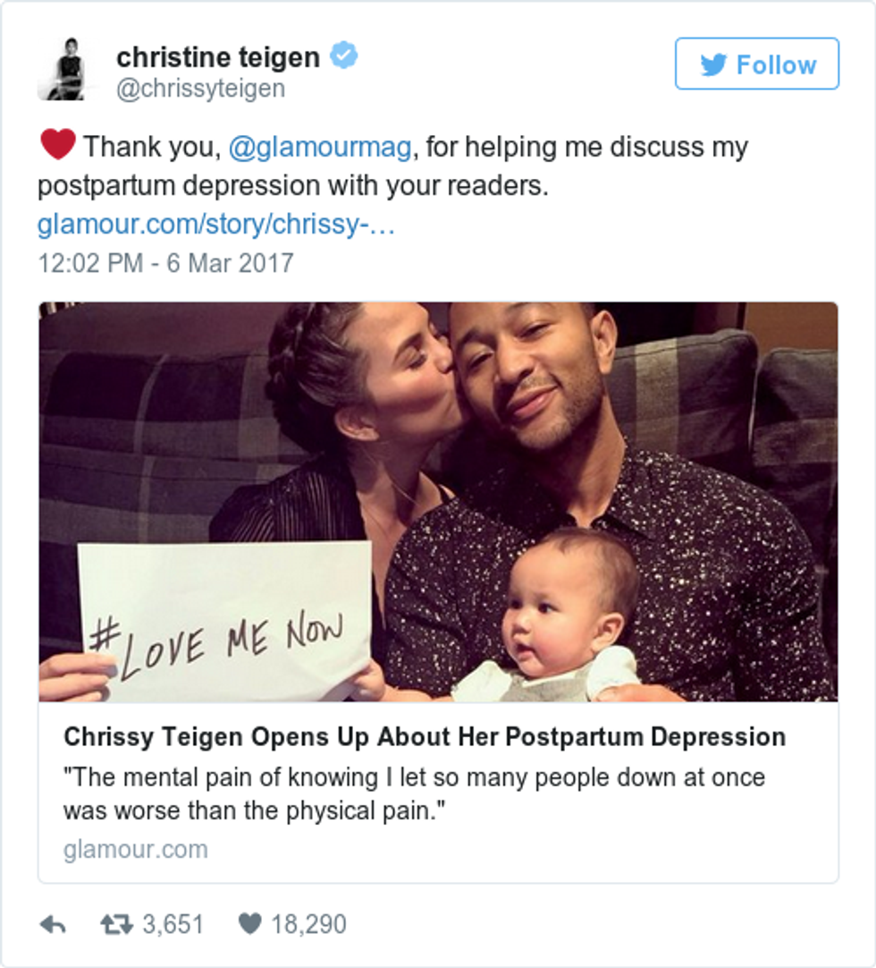 Everyone loves to talk about being a mom and the joys of having a baby to call your own. Only recently have celebrities began talking about the darker side of motherhood, specifically, postpartum depression. Chrissy Teigen writes so beautifully in her all-bearing Glamour spread about going through this after having her daughter Luna. Sometimes we forget that celebrities are just people like us.