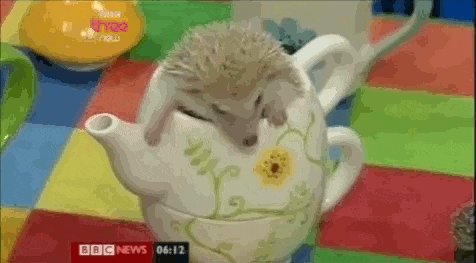 Oh you wanted to make tea but your hedgehog is in the pot? I guess you'll have to wait until he's done because he's too cute to move.