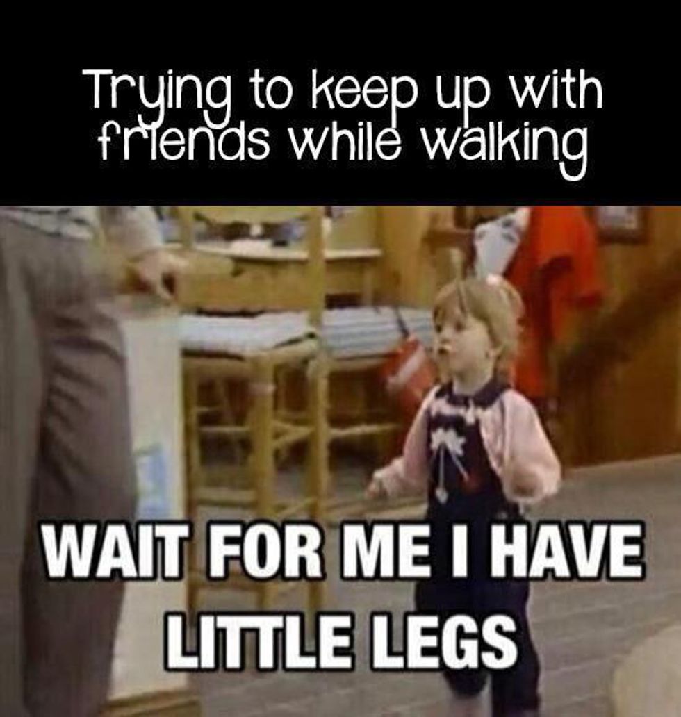 My strides are so much shorter than my tall friends. I am typically a fast walker, but when you are walking with one of your tall best friends it easy to get left behind. They usually have longer legs so their steps are a lot bigger and more spread out than yours creating more distance faster. Our short little legs are powerful, but sometimes we are running to catch back up or keep the pace. "Wait for me I have little legs," has to be one of my favorite quotes.