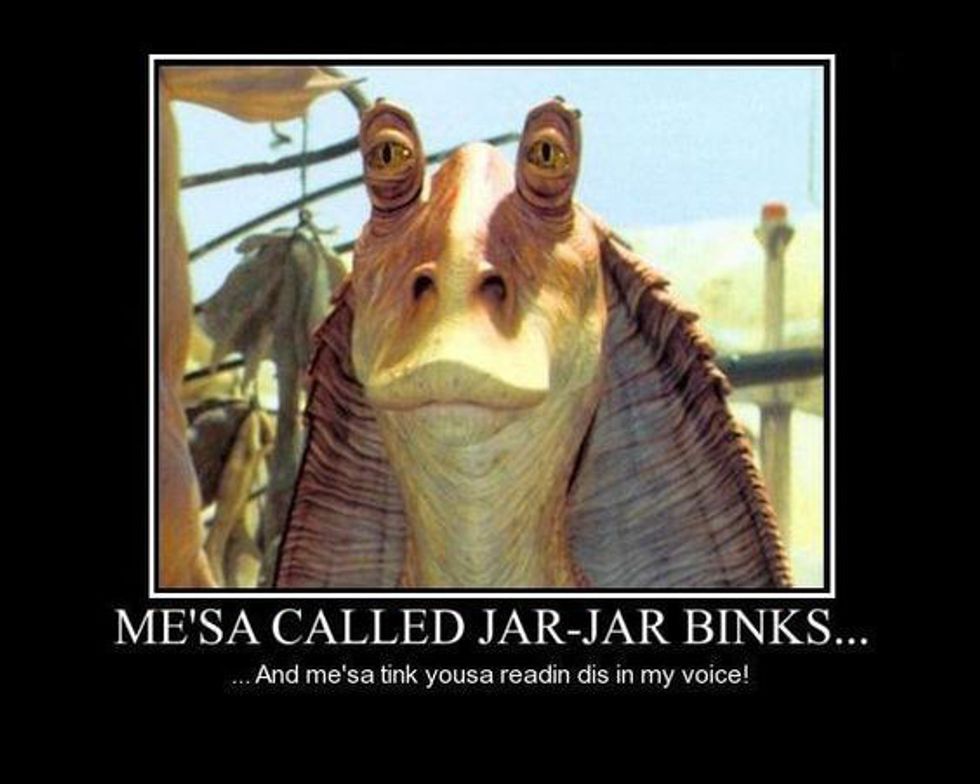 Stand aside Han Solo, Darth Vader, and C3PO. Jar-Jar Binks has entered the building, and he's armed and dangerous with such delightful phrases as "Me'sa Jar-Jar Binks!" and "Esqueeze me!" alongside such classics as "AGH! Monstar! Hah-glabo-globo!"