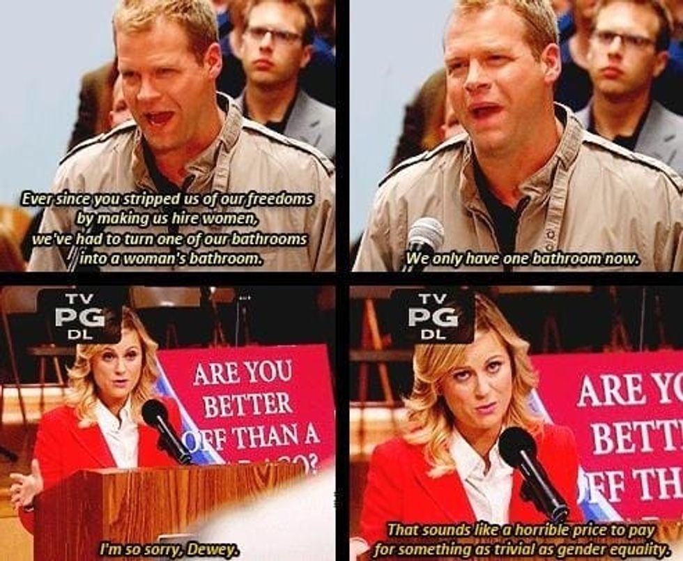 Leslie preaches equality for both men and women, and she challenges stereotypes. She creates job opportunities for women in male dominated fields and she stands up to anyone who questions those decisions. She stands her ground against male rights activists and delivers powerful speeches. She deserves to be Pawneeās Woman of the Year.