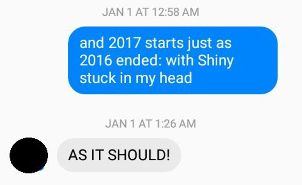 That's a real conversation between my roommate and myself. I could not get "Shiny" out of my head, but I wasn't able to sing it since no one in my family had seen the movie yet and I didn't want to spoil anything for them.