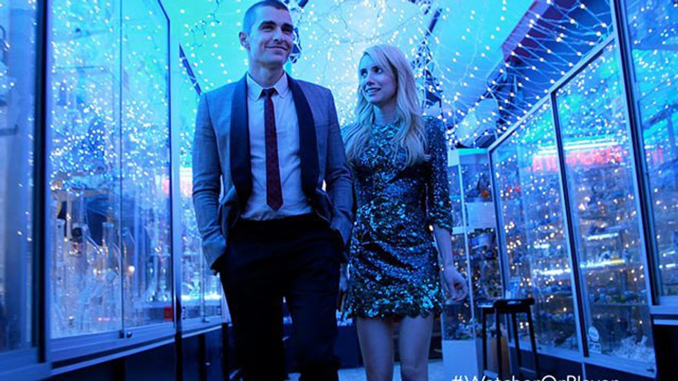 Each scene in this movie was splashed with the most vivid colors. Neon lights played one of the main roles as they bathed each shot in its own rich color. Because most of the movie takes place after dark, each scene is set by the color of the light used. A tattoo parlor is illuminated by a red glow as Vee and Ian begin to get closer and the sparks fly. The blue light emitting from the bottom of Ian's motorcycle takes them on a terrifying ride through the city and the sterile white florescent lights alert the audience to the fact that the game has become dangerous.9. Dave Franco