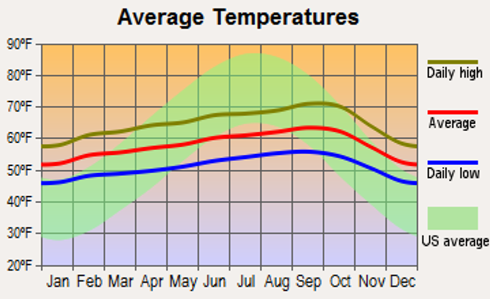 While only the Bay and coastal areas stay in the sixties year-round, Northern California is much cooler than Southern California. The average rainfall is higher (hence the forests) and the humidity is noticeably lower. There's plenty of desert states nearby.... isn't California supposed to be "different"?