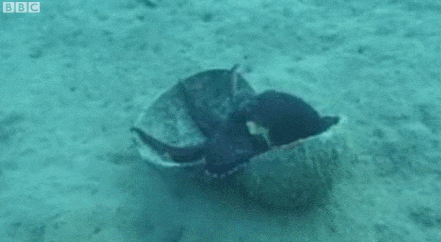 Though Octopuses are in the mollusk family, they lack a hard outer shell. This predicament is no match for these cunning creatures, as they’ve been known to find and make their own. Octopuses living off of the Indonesian coast have been observed picking up discarded coconut halves from the ocean floor and carrying them around for protection. Other octopuses do the same with glass bottles, cans and even shells from other mollusks.