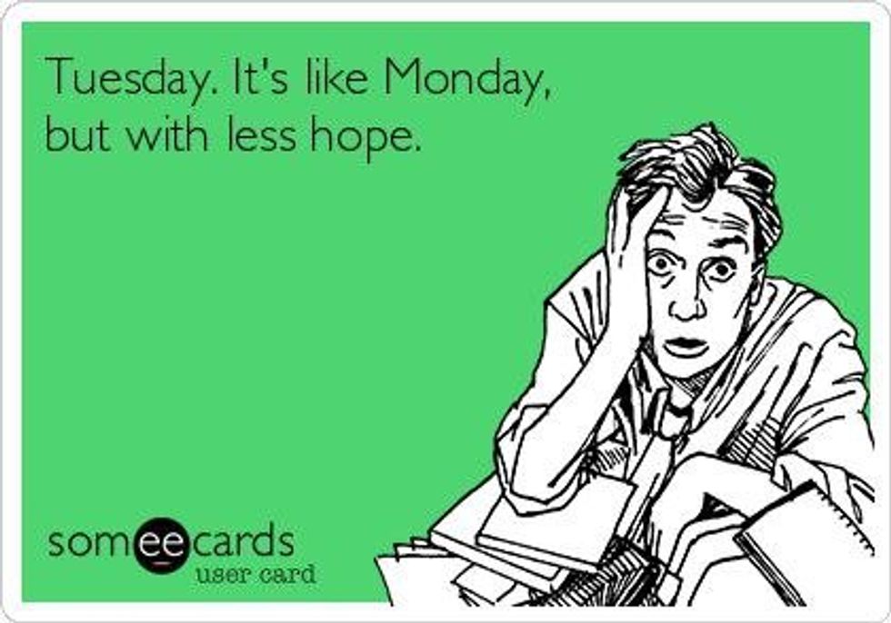 Everyone has their least favorite day of the week. Most people say Monday, and understandably so. Some people say Sunday, because it's the last day of the weekend. Some people may even say Thursday, because you feel like its the weekend, but you're still not quite there. But for me, my expectations for Mondays are already so low, that it ends up being one of my better days of the week. Sunday is my last day for a few days that I can actually get a nap in. And Thursdays are so close to Fridays, that I am already in a good mood. Tuesdays, however, should be called WorstDays -- and here are 10 reasons why.