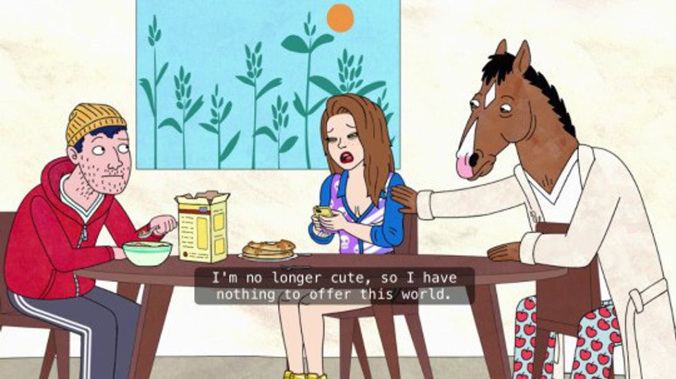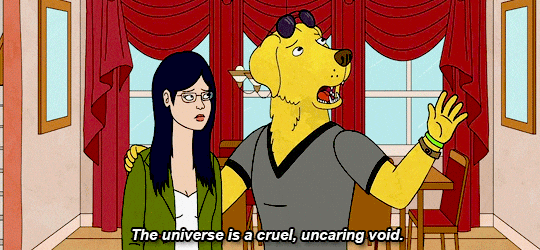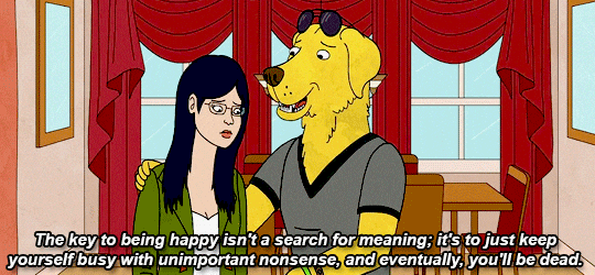 This show is both hilarious and sad. BoJack is in denial with depression and he tries to fill his void with alcohol, drugs, toxic lovers, and even an Oscar nomination and yet he can't seem to shake the whole in his heart. His friends try to help him, but conflict arises because BoJack is actually a terrible friend and manipulates those he cares about. It really gives the viewer what depression is like, and it doesn't sugar coat it. If you haven't started watching it, I suggest you do. It's a great show and I'm not just horsin' around.