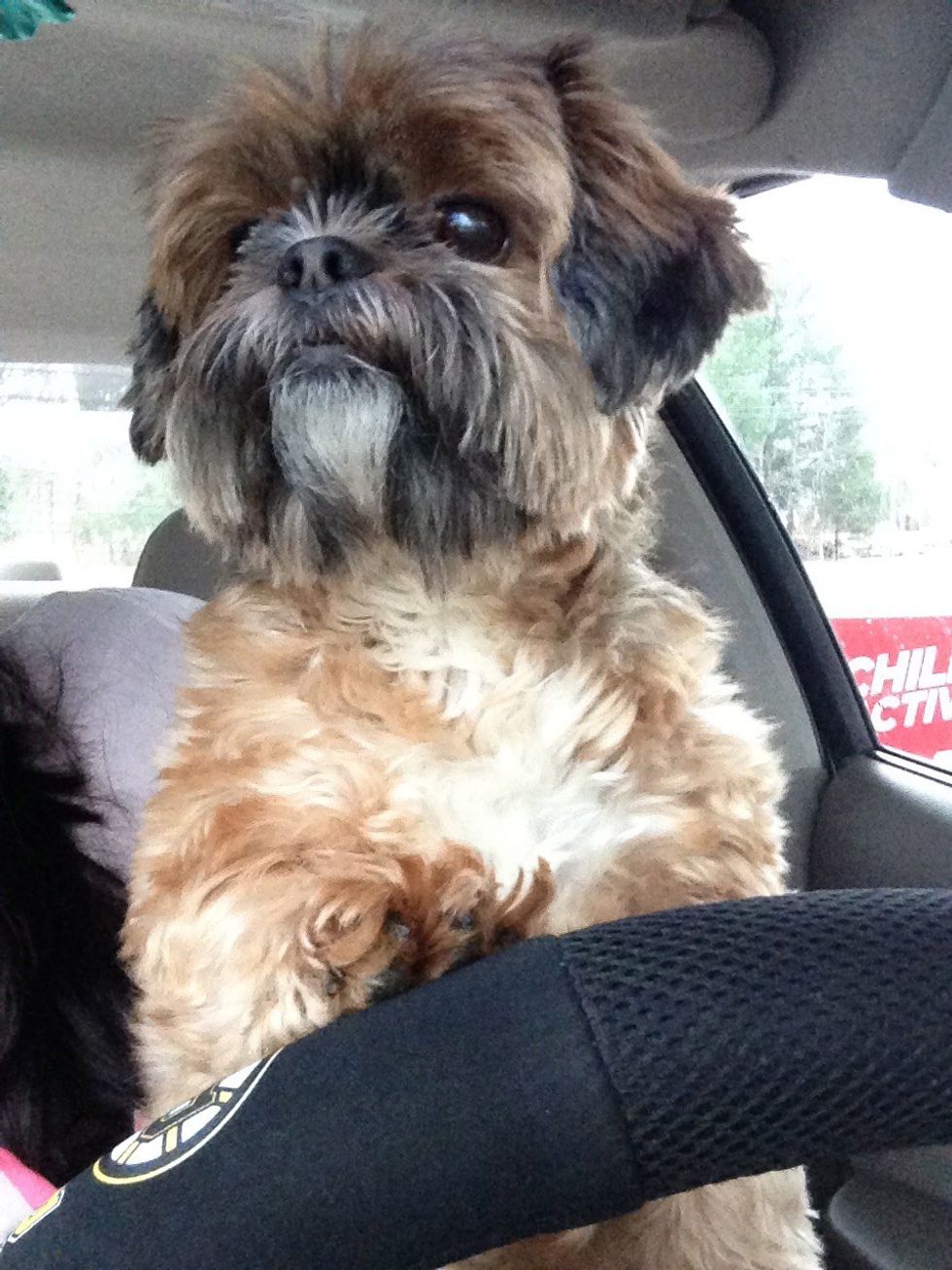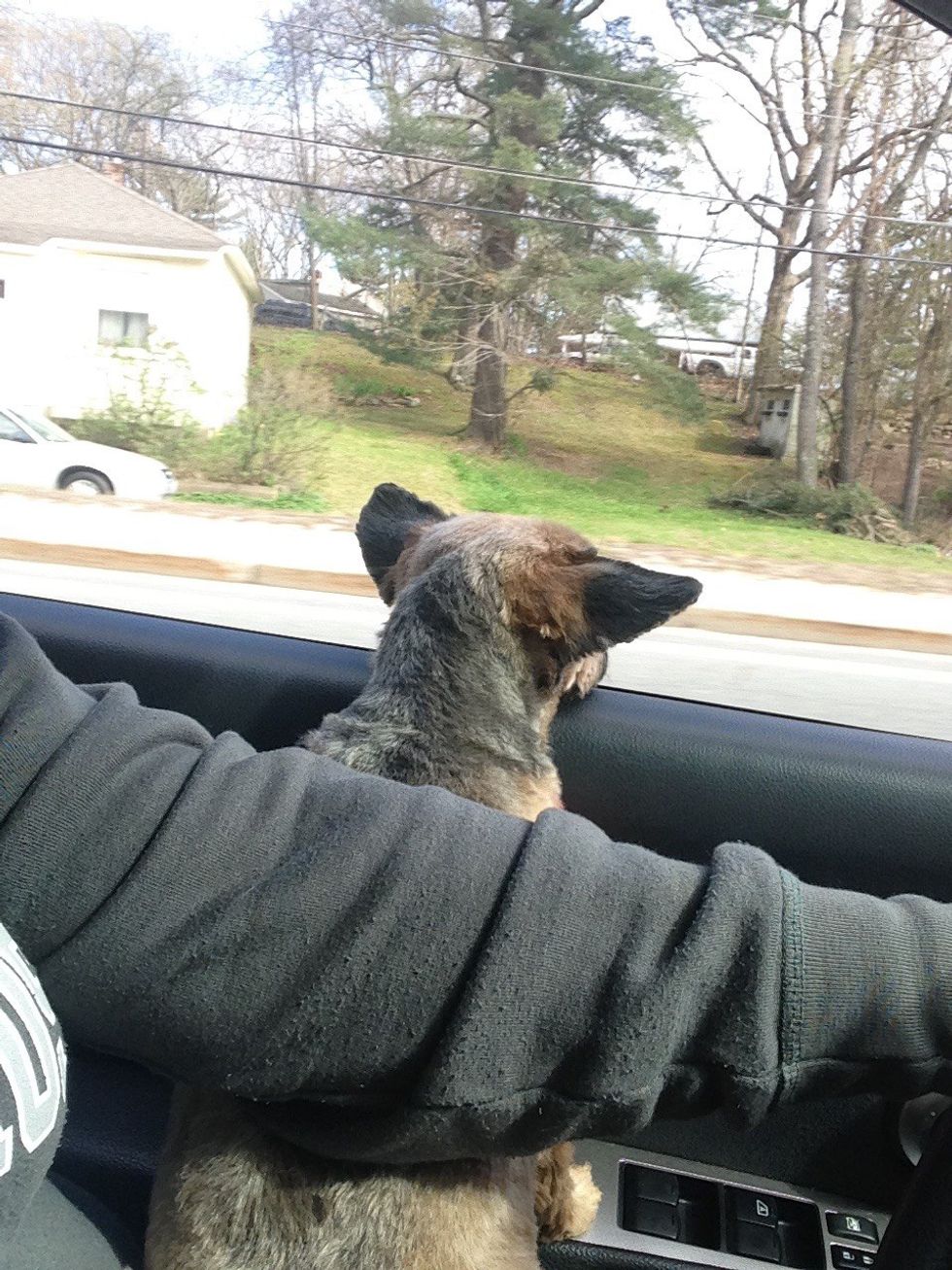 My dog loves car rides with a burning passion. Something about the wind in his face makes him extremely happy. Whenever we say "Do you wanna go for a ride?" He jumps up and gets really excited. Taking him for a ride is the best.