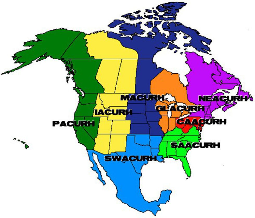 A little bit of NACURH, in NACURH there are eight regions such as Midwest, Central Atlantic, Great Lakes, Northeast, Inter-mountain, Pacific, Southwest and South Atlantic. And in addition to the NACURH conference, each regions held one regional leadership conference and one business meeting every year as well.