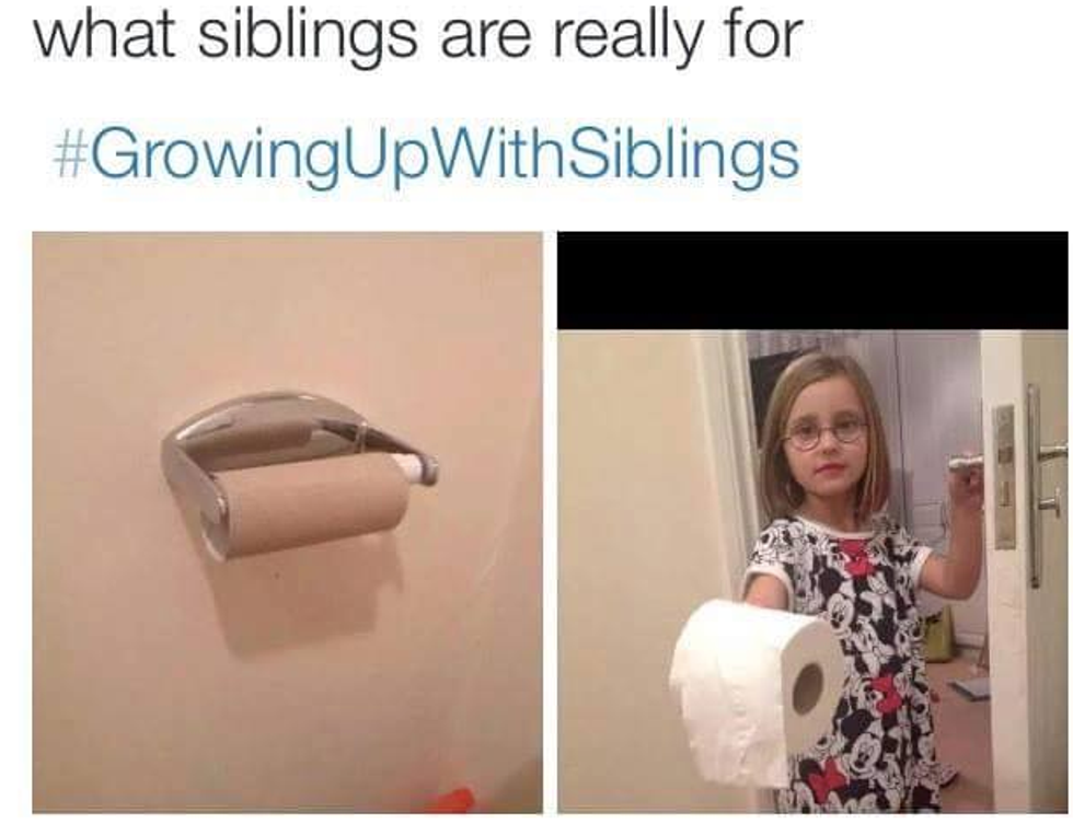 Whether you are squatting over a disgusting toilet on a road trip with your family or comfortably using your own bathroom, you occasionally run out toilet paper. Unfortunately, your pants are already down and you are now in a sticky situation. Luckily, your sibling understands your bathroom needs. They are always there with toilet paper, whether it be an entire role or just passing a wad of toilet paper under the bathroom stall.