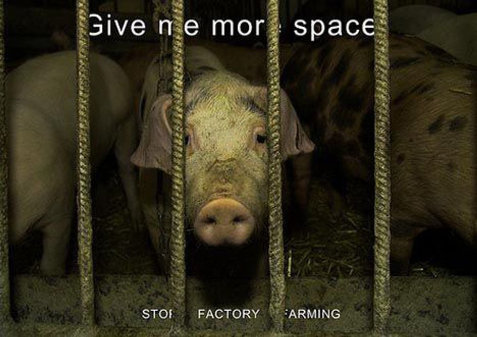Thousands of chickens shoved into a small shed, with their extremely sensitive beaks cut off as to prevent pecking. Pigs and cows are locked in a dark room, unable to move for their entire lives, stuffed with antibiotics, and not exposed to sunlight until the day they are slaughtered.