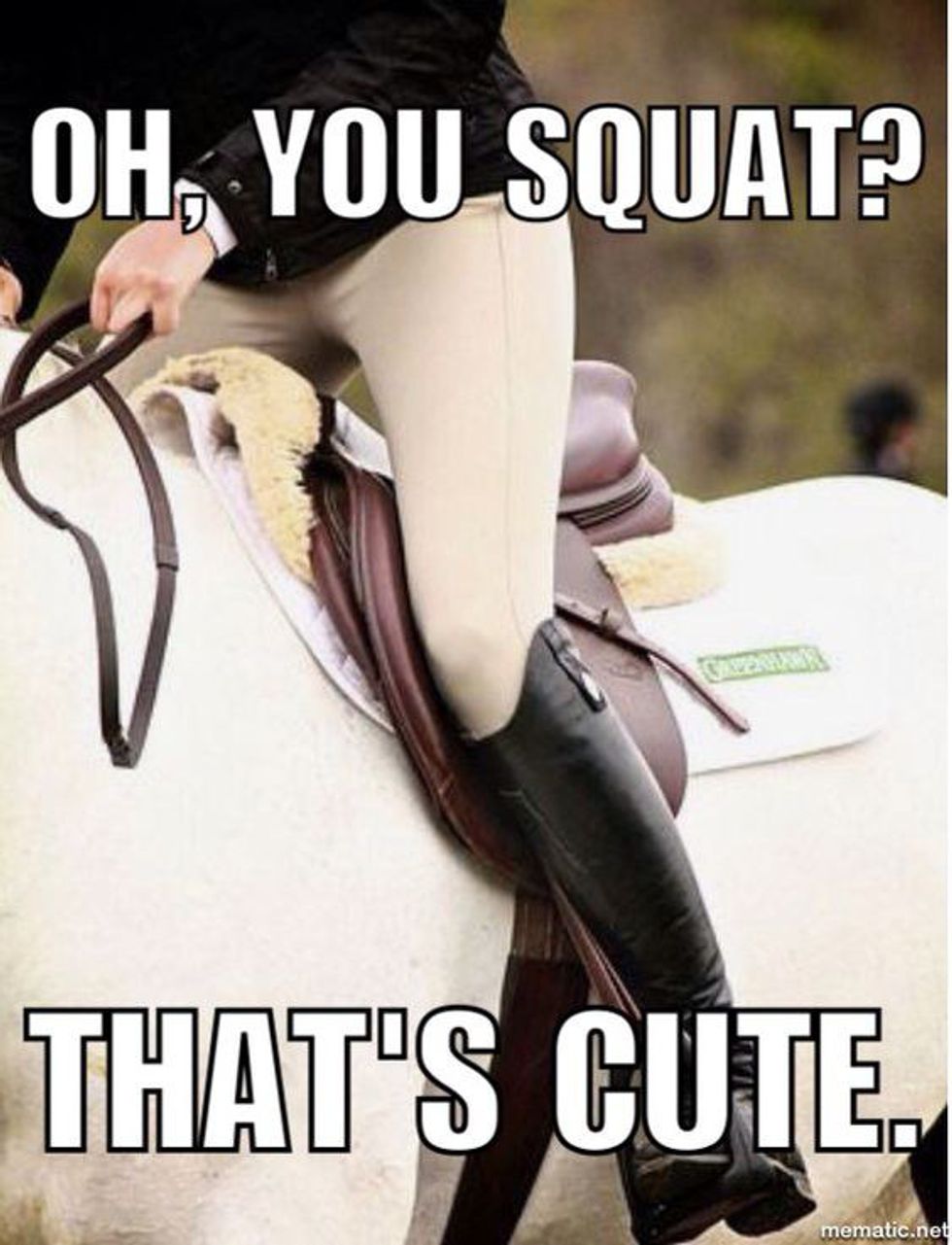 You may just squat for the benefit of a fitter butt and legs. We, however, use every muscle in our legs and butt to ride our horses effectively. Every time we get off our horses, we can feel the muscles we worked.