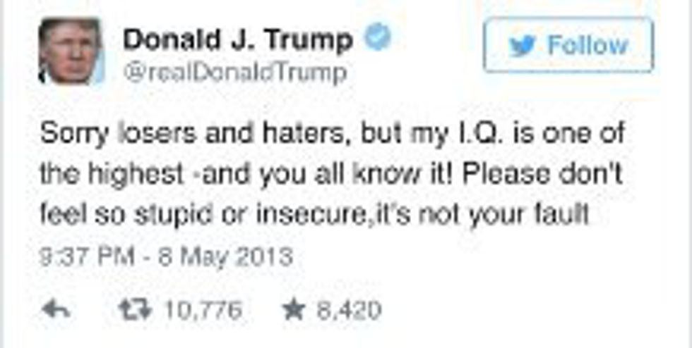 By the way, screw you, Obama. You passed a health care reform, ended the war in Iraq, began the draw-down of the war in Afghanistan, eliminated Osama bin Laden, boosted fuel efficiency standards, eliminated Catch-22 in pay-equality laws, protected two liberal seats on the U.S. Supreme Court, expanded Wilderness and Watershed Protection, invested heavily in renewable technology, improved school nutrition, expanded health coverage for children, extended stem cell research, helped South Sudan declare independence, killed the F-22, and did much more... But you're still stupid. Trump said so.