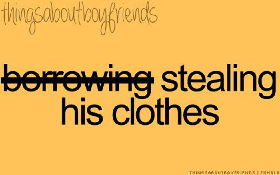 OK, I'm probably the one in the relationship that does the stealing of the clothes, but still. He's probably not too happy about it, but what can I say? I just feel so comfortable and safe in that sweatshirt, so you just can't say no! (Oh, and P.S., when you say, "Can I borrow?" it actually means "I'm keeping this").