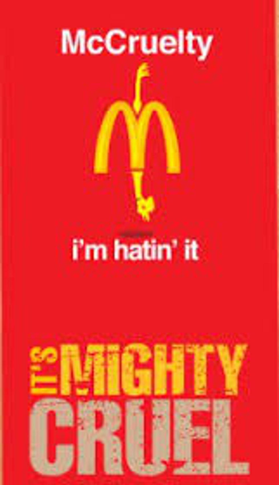 This is not a fake advertisement. PETA (People for the Ethical Treatment ofAnimals) has a whole website regarding McCruelty. McDonald's chicken suppliers kills the birds with cruel and inhumane methods. PETA has tried many times to work with McDonald's to create more humane methods in the factories and food industries, but McDonald's has continued to refuse. What does it say about a company if they're willing to kill living creatures with painful methods? In McDonald's slaughterhouses, chickens are dumped out of their crates and hung upside down in shackles. They can suffer broken bones and hemorrhages. The birds also suffer abuse. Sometimes birds have their throats cut while they are still ALIVE. The chickens are also dipped in burning hot water. Please stop supporting McCruelty.