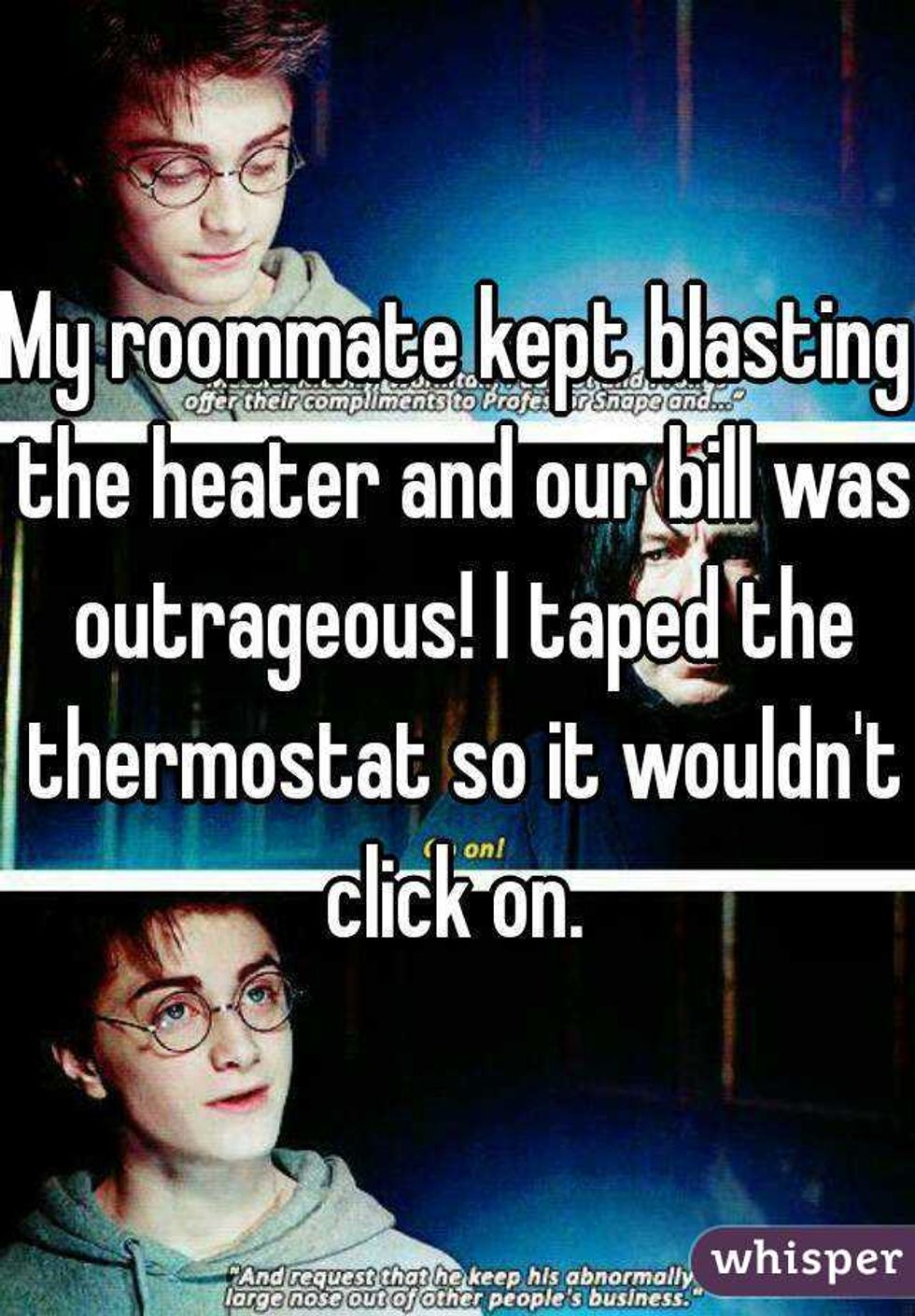 hen you first move-in together it’s a fairly smart idea to discuss the thermostat issue. Decide and agree on a temperature for the summer and winter months, and stick with it! Nothing is more annoying than having a roommate set the A/C on 65 degrees in the winter but 82 degrees in the summer. If a battle over the thermostat is initiated, be ready for a steep electric bill.