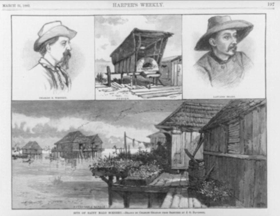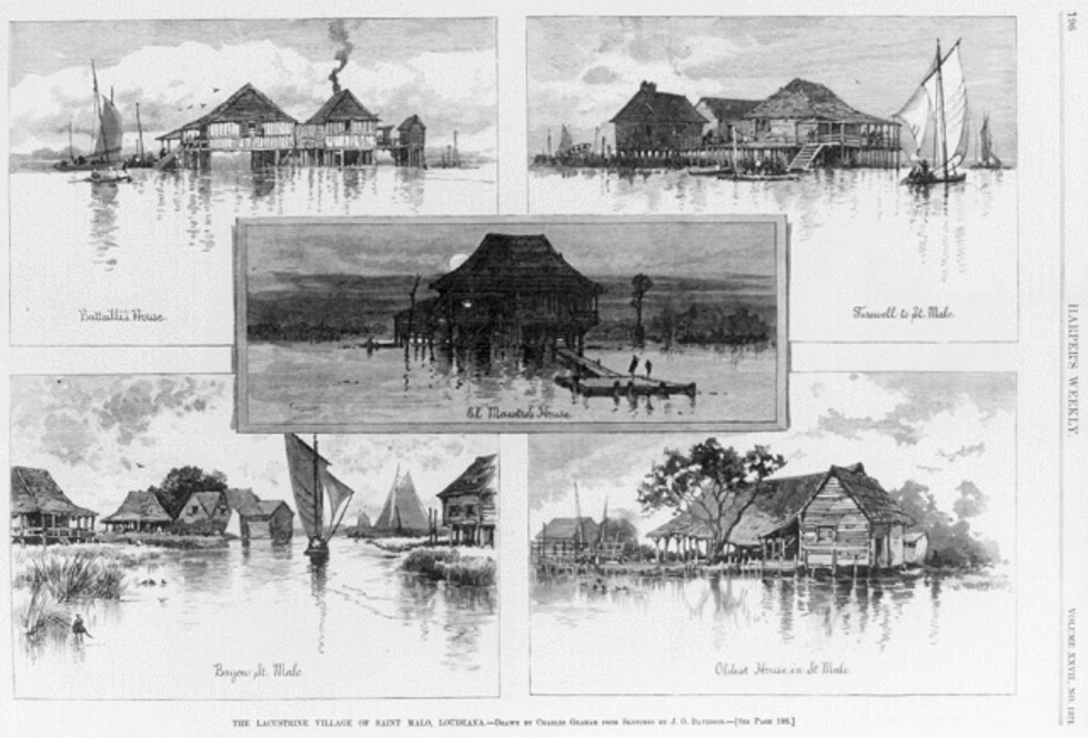 Observed by Lafcadio Hearn, who wrote the first ever article about American Filipinos for Harper’s Weekly in 1883, "Manila Men" established St. Malo, a village outside of the bayous of New Orleans, Louisiana which became the first Filipino settlement in the United States. Sometime around the 18th to 20th century, some Filipinos would travel to Mexico on Spanish trading ships during the time the Philippines was concurrently being colonized by Spain.A group of them made their way to New Orleans as a way to escape and hide from the Spanish. The migration to the new area wasn't too difficult for them to adapt to, as they made homes in the marshlands similar to fishermen stilt homes in the Philippines. They built these homes on stilts, which would later become widely used and well-known as lower Mississippi River and New Orleans batture houses.