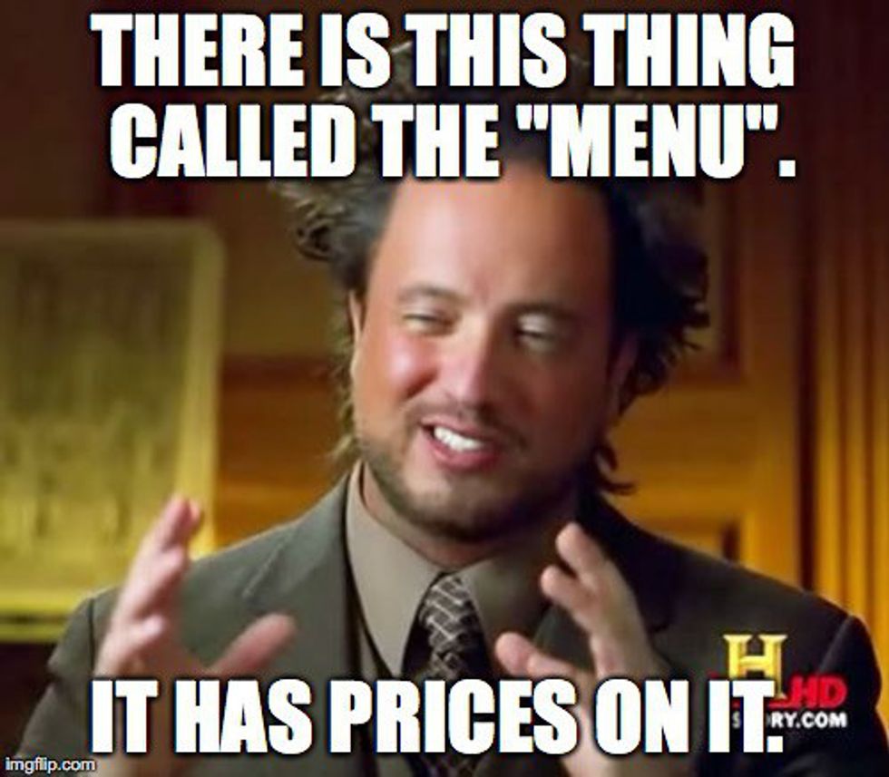 If I had a dollar for every time a customer was not too happy with me over the price of their meal, I would make more than me and my coworkers combined in a week. The price was on the menu before you ordered, I swear. I'm not trying to break your wallet.