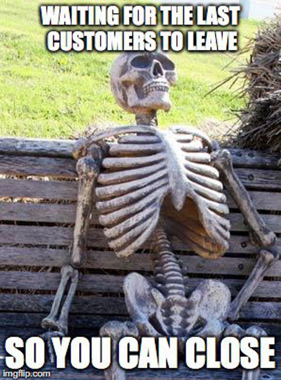 There you are, in the middle of closing down your stuff. You think you are home free, only five more minutes before the doors are locked. Then it happens -- someone walks in. You think, OK, just get some food and go. Only, they don't want it to go. They insist on eating in your freshly cleaned dining room and staying at least 10 minutes after closing. But you keep your cool, even if you are dying on the inside.