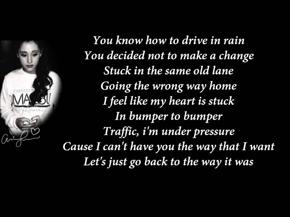 This song always gets me through a tough time. Ariana talks about how she loves this person, but something is in the way which makes her try and stop her feelings. Whatever is wedging the two apart, there's no sign of changing it. A good song for someone wishing to go back to the beginning of the relationship (aka. the good part).