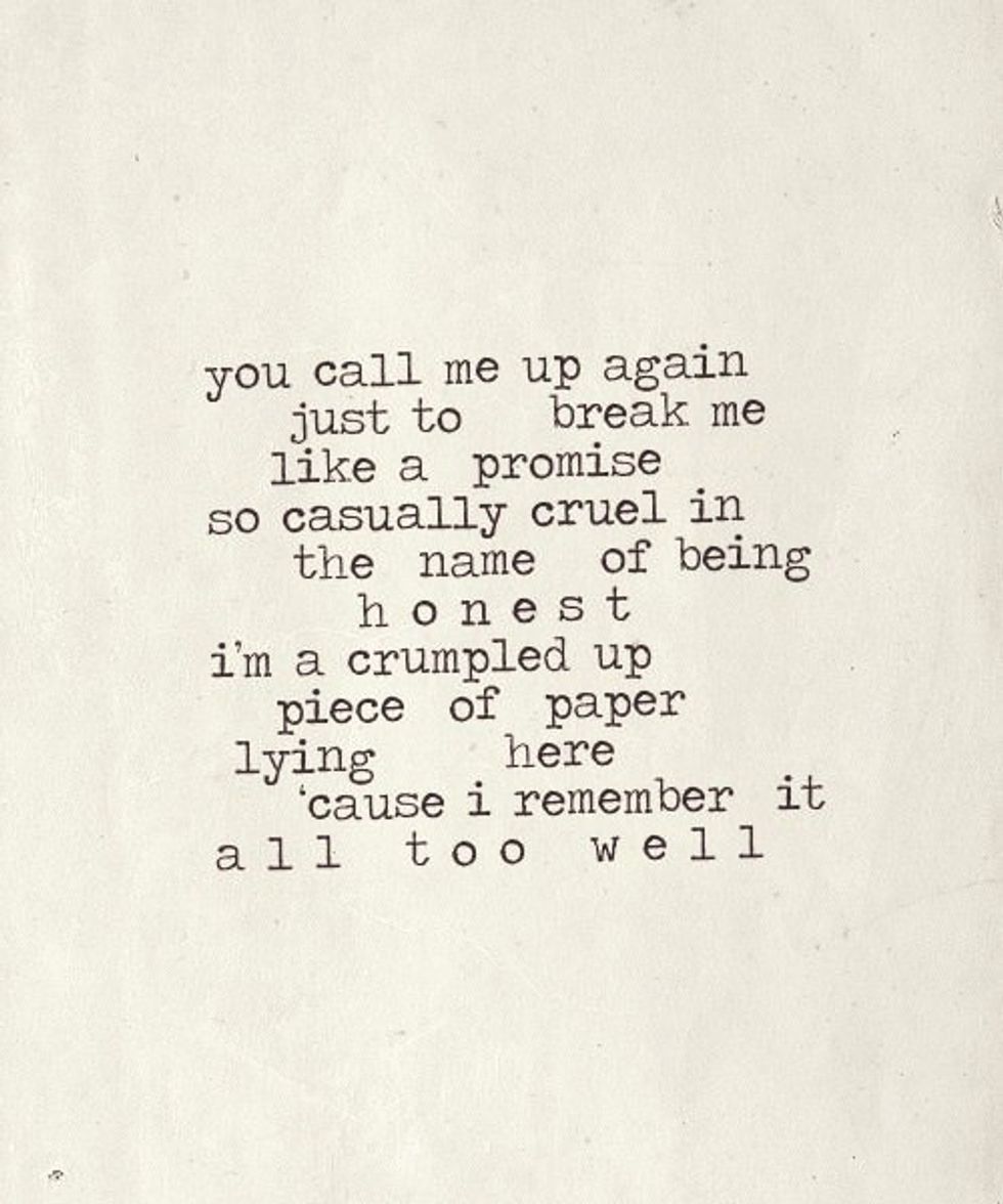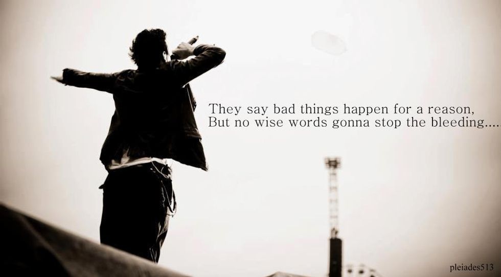 You can be hurt for so many reasons, and so many different types of people could’ve been the cause of your pain. Songs that have a purpose are ones that I find the most appealing and all these songs have a message behind them. Regardless of why you are hurt-- you aren’t alone... Someone is struggling along with you and these songs were written to remind you of that. Though R.E.M.'s "Everybody Hurts" isn't on the list because of it's more obvious nature, it still stands as a theme because "everybody hurts sometimes."