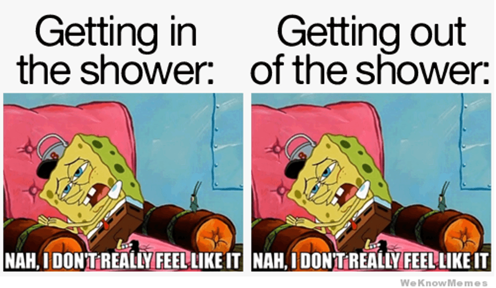 Me every morning Monday through Thursday (Because I wake up at 6:30 to shower, get dressed, go get breakfast and then go to work at 8). I don't always feel like getting out of bed and into the shower but once I'm in I want to stay in. It feels so nice and now it's cold outside the shower.