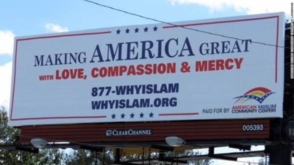 Through a unique interpretation of Trump's campaign catchphrase, The American Muslim Community Centers bought a set of billboards promoting love and compassion along two major Florida highways. The AMCC hopes these billboards serve as a reminder that the Muslim community is active in politics and serves their neighbors through volunteering.