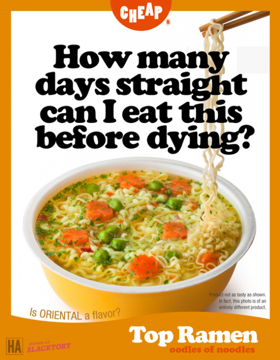 10. Staying hungry... not to keep off the "Freshman 15" but only because the walk is too far. The combination of the Ramen and Gatorade stored away under your bed will probably hold you over for the next 4 days, then onto the granola bars.