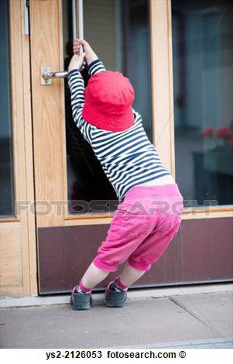 Doors are not simple for small people, especially if they're heavy. We don't have enough force to pull upon the door. And if the wind is pushing the door shut, forget it. That door is never opening.
