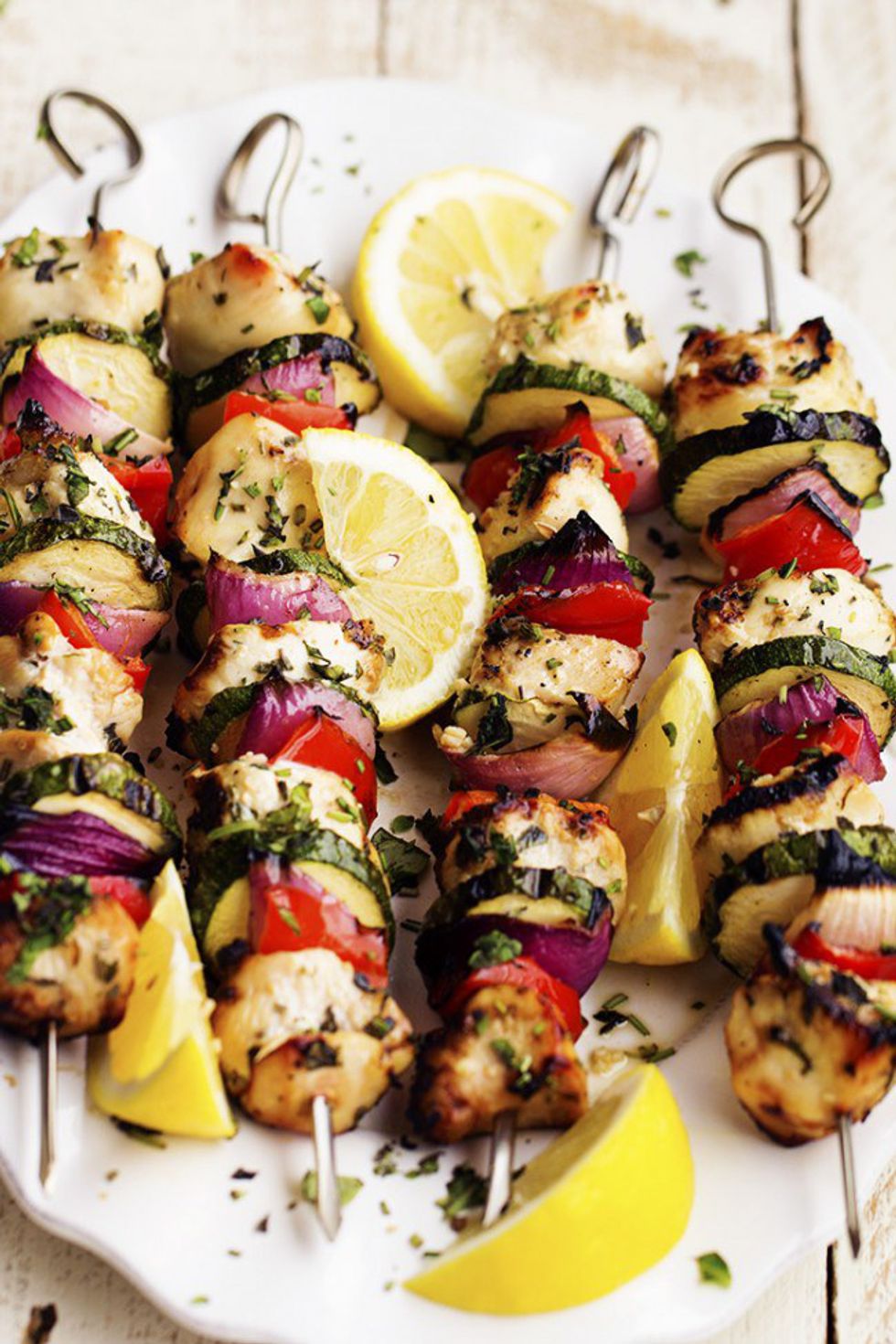 This recipe calls for herbs like basil, oregano, and parsley that make for an absolutely amazing marinade for the perfect summer chicken. By alternating the chicken with veggies like red peppers, onions, and zucchini to create a summer skewer that is truly exceptional.