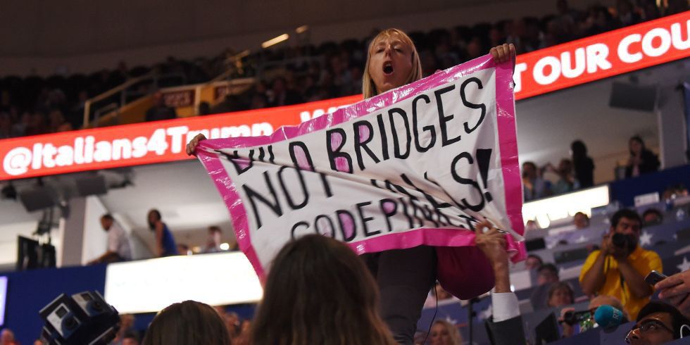 Not taking down the protester (code pink). At previous rallies, Trump would mention and take down any protesters present at his rallies. However, at the RNC, he displayed a surprising restraint against protestor. The protestor is a member of Code Pink: Women for Peace, which is a NGO that “CODEPINK is a women-led grassroots organization working to end U.S. wars and militarism, support peace and human rights initiatives, and redirect our tax dollars into healthcare, education, green jobs and other life-affirming programs”.