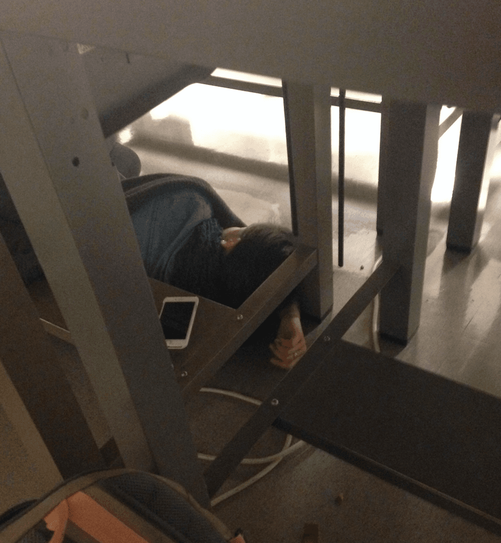 Under and on top of desk, hallways, stairwells and even the occasional standing nap.