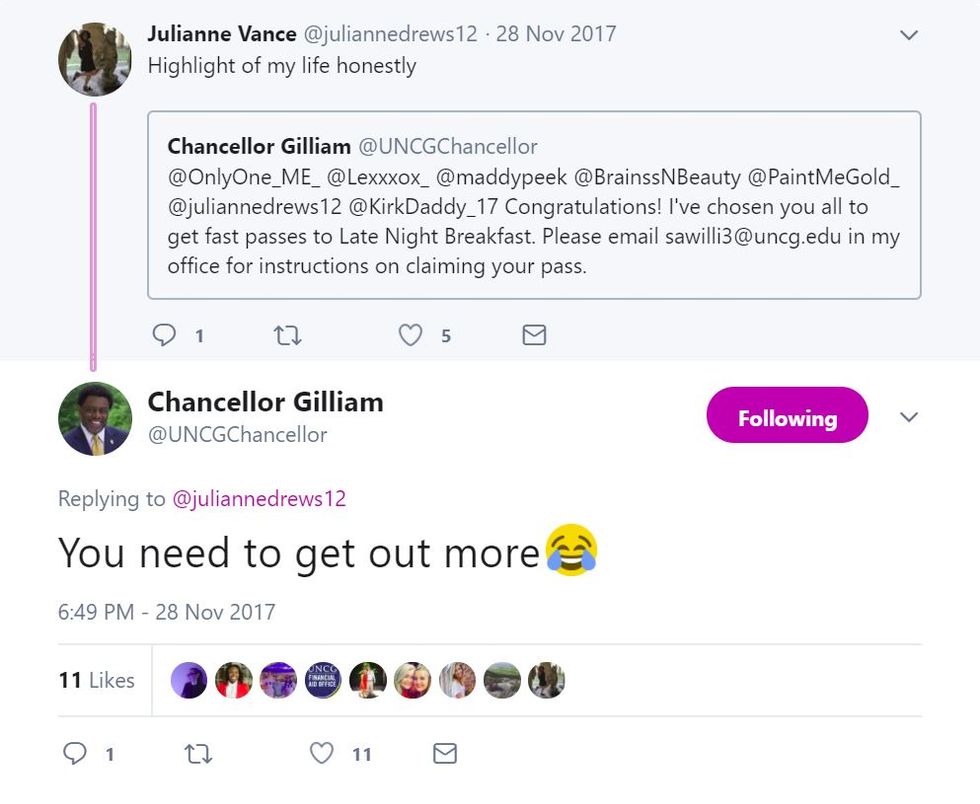 You can realistically do this when you leave too, but if he replies you are officially UNCG famous for a day so you should do it now to maximize your fame. You also might get slayed.