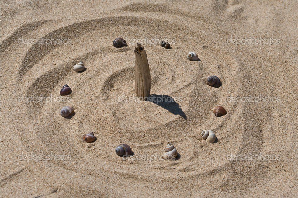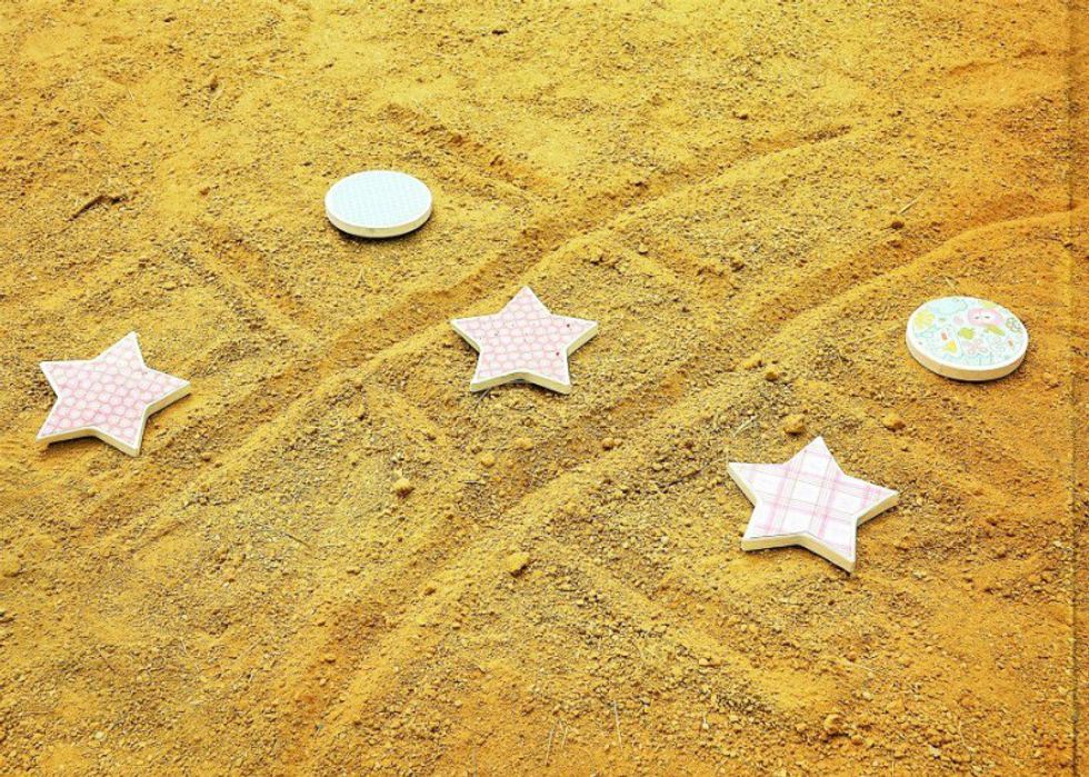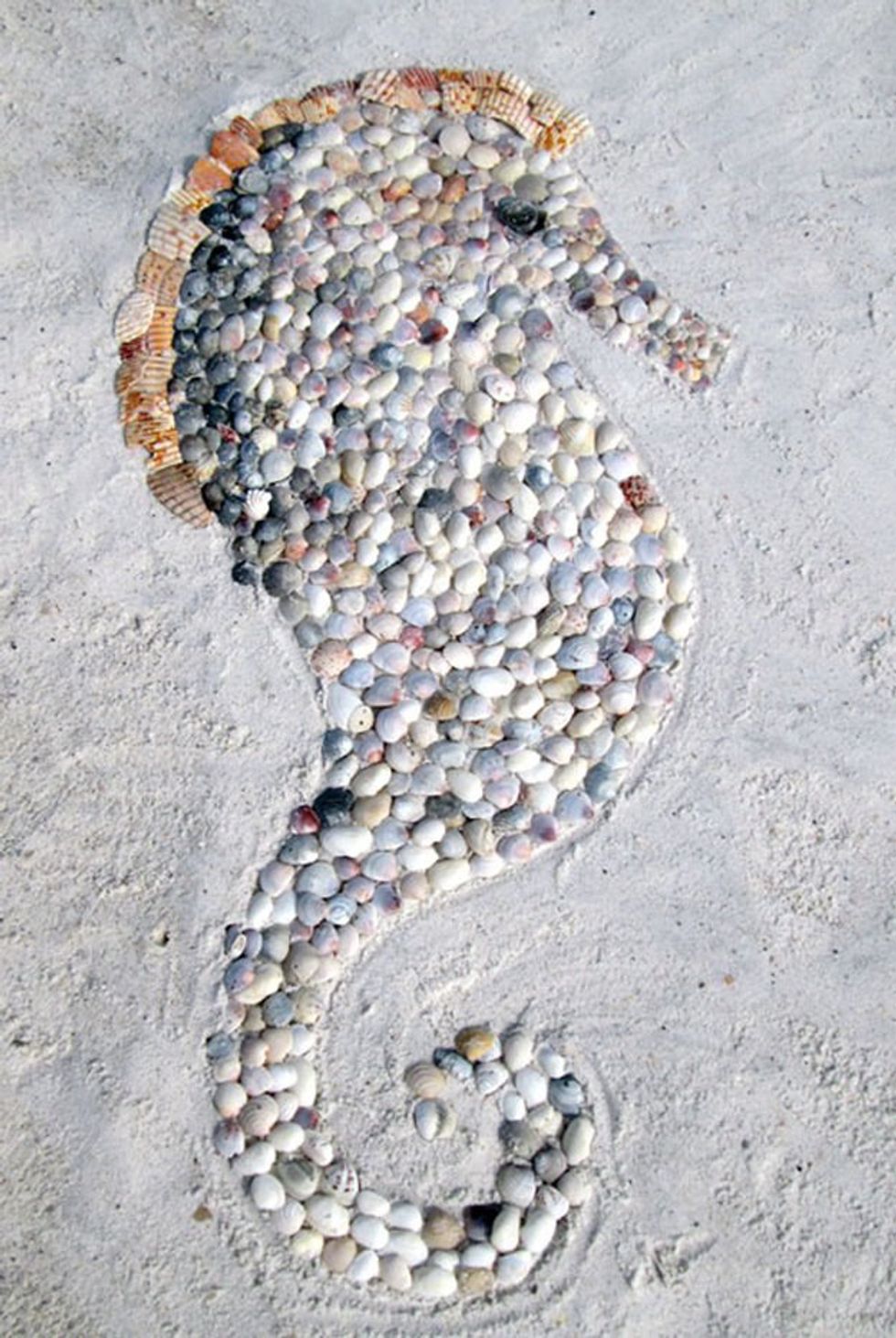 Use the rocks, seashells, and whatever else you can find to make what comes to mind in the sand.