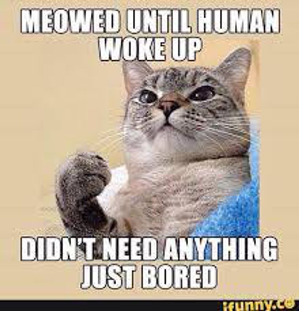 Activities like this are the pinnacle of cat unpredictability. Whenever it strikes their fancy, at whatever time of day your cat may just randomly decide it's time to meow. This could indicate they're hungry, lonely or just feel like being annoying.