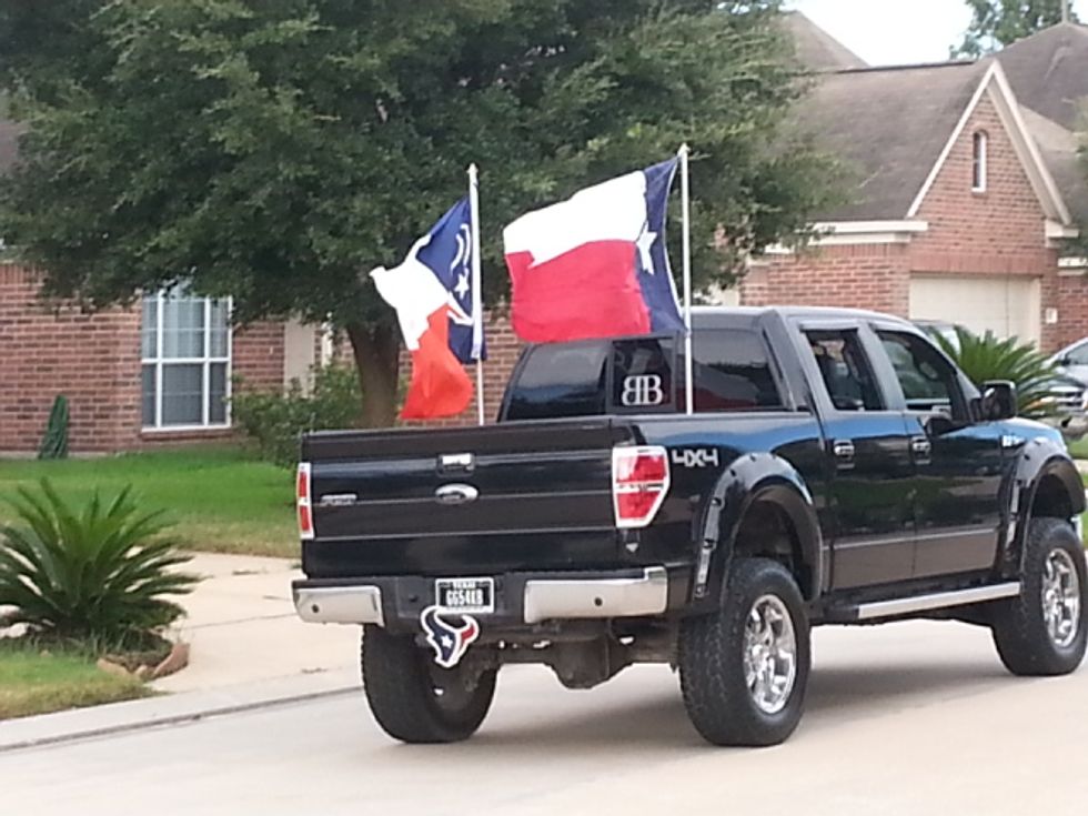 8. Texas and American flags are on the back of SO many trucks.