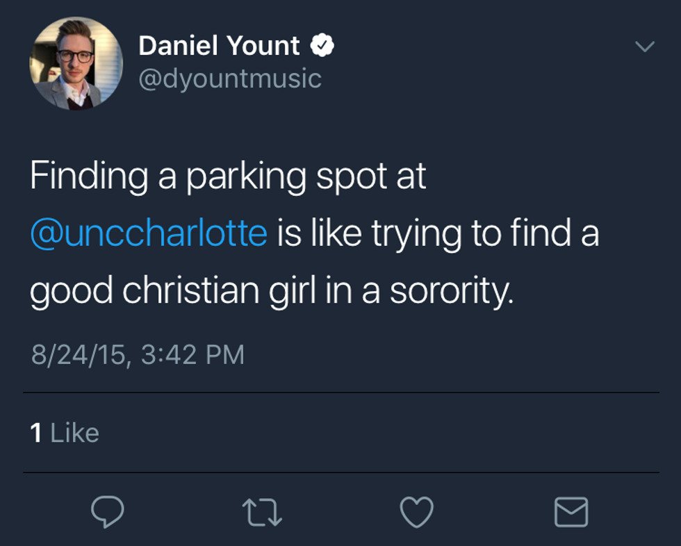 When it comes to parking at UNC Charlotte it is like fighting till death for a parking spot. Especially in the decks. With me living on campus I would like to be able to just find a parking spot easily and not spend ten to fifteen minutes going in circles trying to find one. Since there are a lot of commuters that come to UNCC there is not enough parking for everyone. Which, I think is not very fair for the ones that live on campus and have to park a mile away from their building they live in. "What is an extreme sport?" Finding a parking spot at UNC Charlotte.