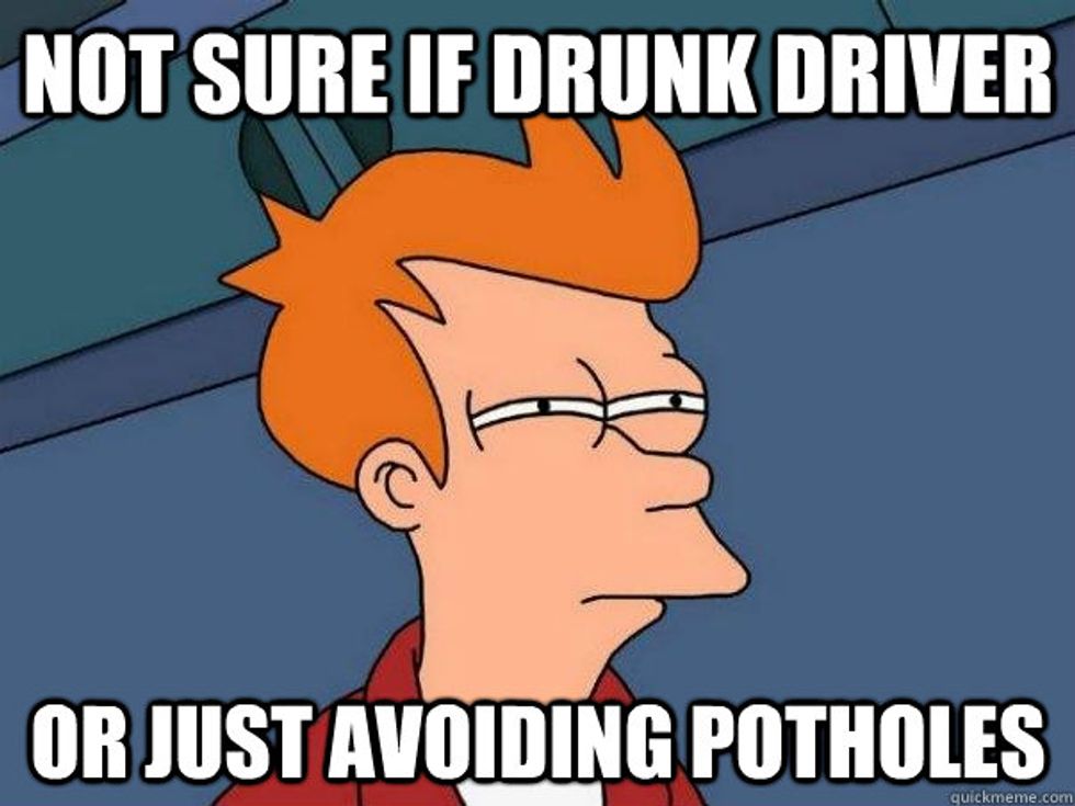 You’re never sure if the person driving in front of you is drunk or just dodging all the potholes in the road, so you just keep your distance anyway