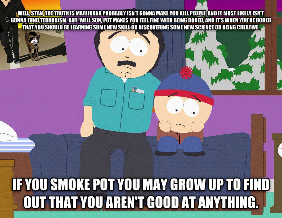 "Well, Stan, the truth is marijuana probably isn't gonna make you kill people, and it most likely isn't gonna fund terrorism, but, well son, pot makes you feel fine with being bored, and it's when you're bored that you should be learning some new skill or discovering some new science or being creative. If you smoke pot you may grow up to find out that you aren't good at anything."