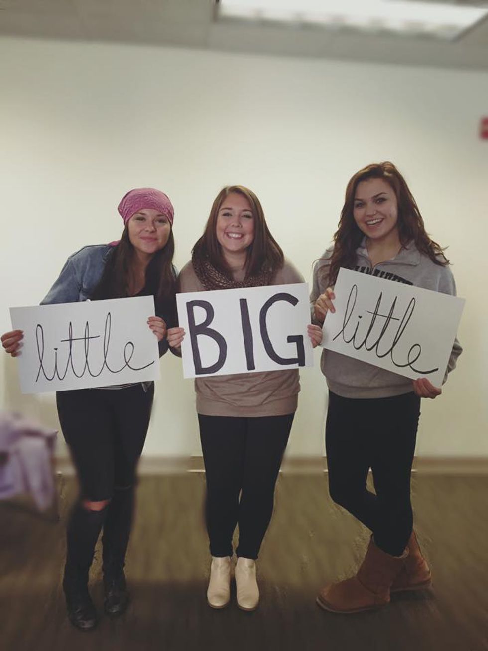 I'm not joking. Your big is someone who can mold your entire greek experience. She is there for you every step of the way, helping and guiding. My big is a strong, and kind hearted woman whom I look up to immensely. She quickly became one of my best friends, and took me under her wing. This type of friendship is deeper than the others, it's special. She will know your exact thoughts and feelings before you even do because she has been in your shoes. Your big is your rock. So thank you, you have no idea how much you mean to me.