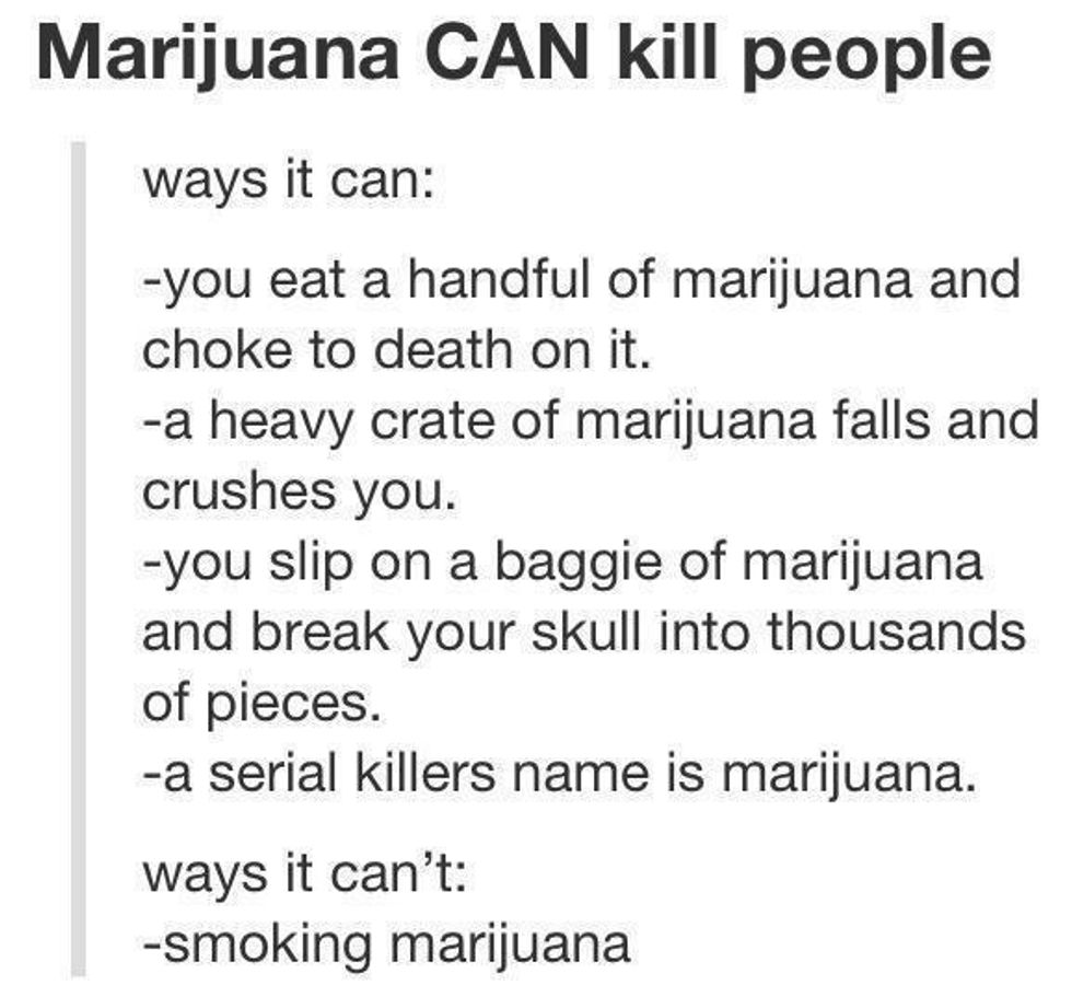 I continuously hear from marijuana opponents about the potential dangers that come from cannabis use. I just can't take them seriously. They can't say it's dangerous and therefore should remain illegal, yet be perfectly fine with other things that are much more lethal remaining legal.