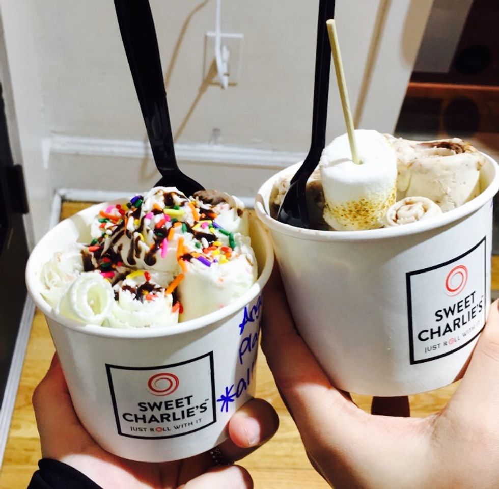 Normally ice cream isn't that exciting, but at Sweet Charlie's it totally is. They make their ice cream from scratch right in front of you on a cold plate with any toppings you choose. It is rolled and placed in a cup where it turns into an ice-cream lover's masterpiece.