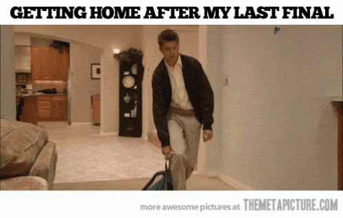 You're tired, you're frustrated, and if you have to sit quietly at your desk while your professor throws YET ANOTHER last minute assignment at you, you are going to scream. Going home will be it's own kind of torture, depending on the political leanings of you and the fam, but at least you'll be able to sleep for a bit to try to undo the torture you've put your body through getting this semester wrapped up. I know it's daunting, but I promise you'll get through this.