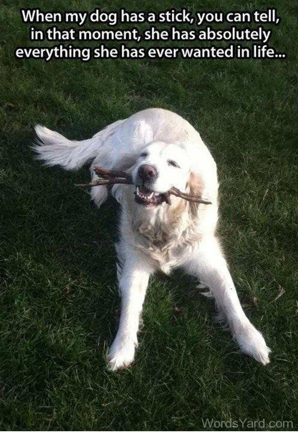 You don't have to buy your dog the coolest, newest toy to make them happy. Seriously. You can make them happy by giving them a stick. Throw the stick, and they'll be even happier. Us humans take this lesson for granted. We can all thank dogs for teaching us that it's the simplest things in life that often matter the most.