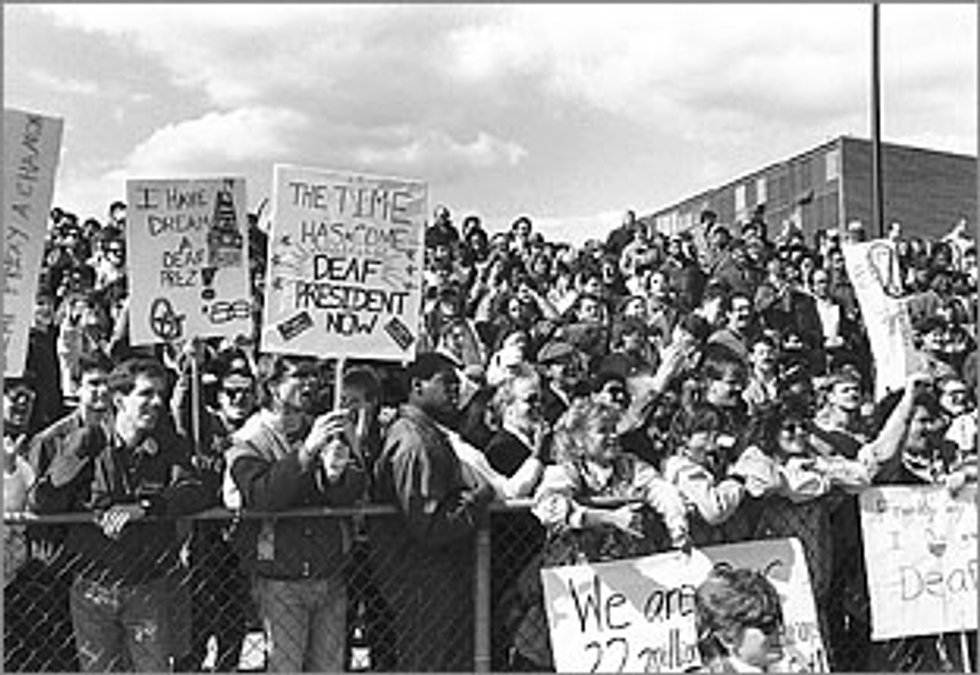 In 1988, students protested for four days in order to have a deaf president at Gallaudet University. It was the first time that there were qualified deaf candidates, yet the school board elected a hearing woman. After four days of protest, the president resigned and the first deaf president of the university was elected.